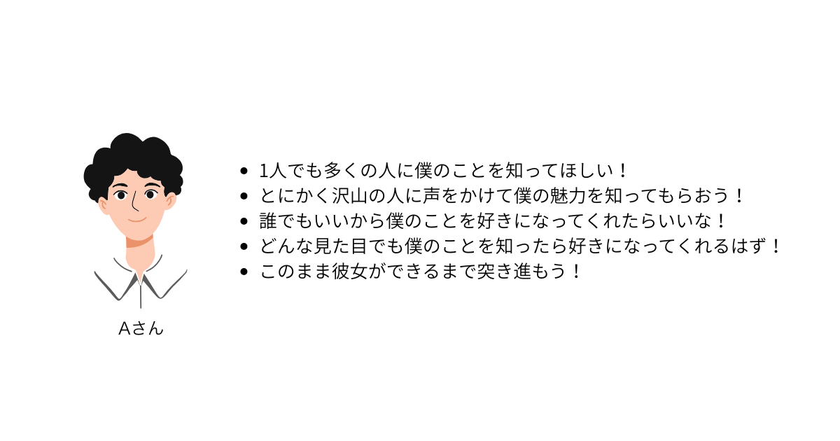 ただ闇雲に「誰でもいいから付き合って!」と声をかけます。相手の好みも考えず、身だしなみは自分の趣味と感性。