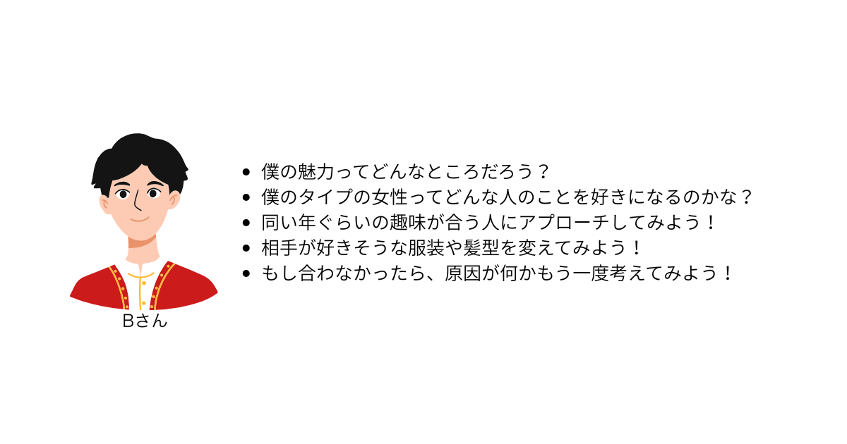 - 施策:「服装を整え、会話を工夫して接点を増やしてみよう」