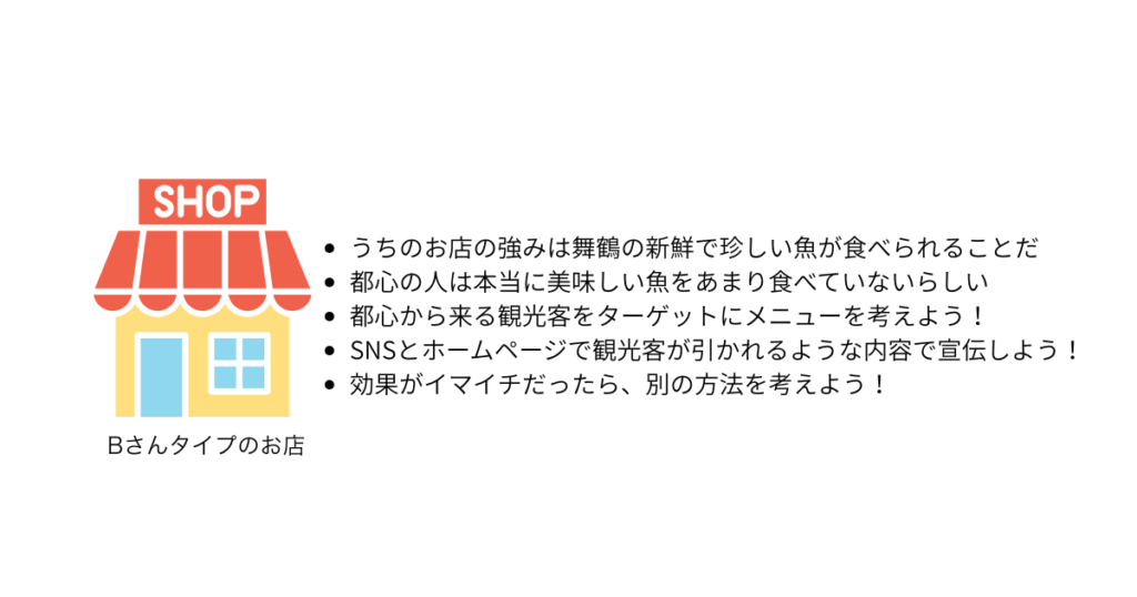 - 振り返り:「観光客の来店は増えたけど地元客には届いていないな、地元の人にはネットよりチラシやポスターで伝える方がいいかも」